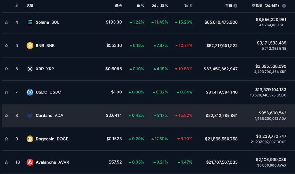 CoinMarkeCap 数据 显示 ,前十大币种近 24 小时普涨,涨幅最大的是 DOGE 和 SOL,分别上扬 17.6% 和 11.49%。