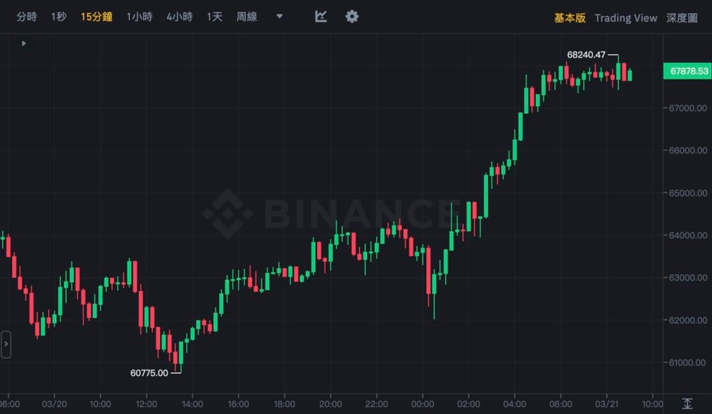 回到加密货币方面,比特币在零点进行最后一次回调之后,就一路高歌猛进从 6.2 万水平拉涨 6000 美元,今(21)晨 08:30 左右最高触及 68,240 美元,昨日的跌幅已全数回补。