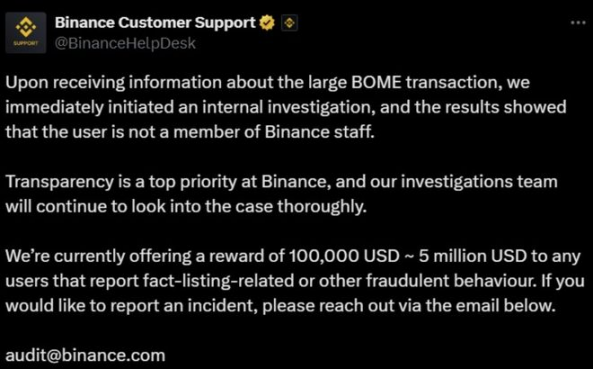 面对此控诉,币安迅速回应,称已启动内部问询,并对围绕BOME的指控展开彻底调查,并强调在初步调查期间,指控的核心人物“与币安没有任何关系”。尽管回应颇为明确,但也难以打消市场疑虑。