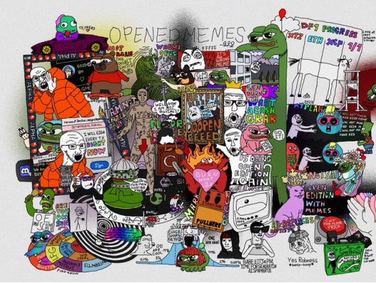 3月10日,此前专注于Pepe Meme图创作的艺术家Darkfarms宣布即将开启Launch项目,并在随后的12日公布了项目名称及概念。在其描述中,“BOOK OF MEME”聚焦于MEME领域,将MEME数据永久存储在 Arweave/IPFS/铭文上,并以此为基础增加部分创作功能。