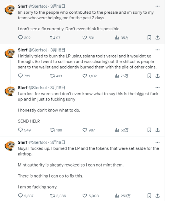 第二天,正当募资者静待交易时,Slerf却上演了一波魔幻操作。创始人 @Slerfsol 突然在 X 平台上发文,称自己因误操作销毁了LP和空投预留代币,铸币权也已经撤销,他对此表示无能为力。就在众人懵逼疑惑真假时,其再度表达了自己的歉意,称真的不是开玩笑,对于参与预售的人感到抱歉,也对不起自己的团队。