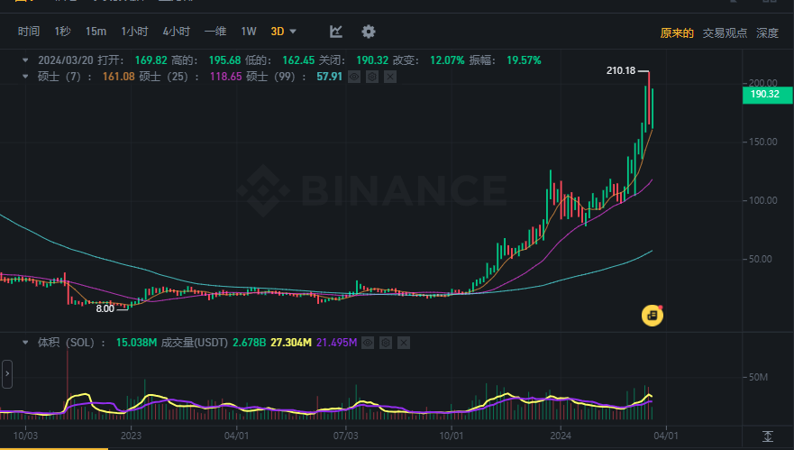 可以看到,Solana是这场预售游戏最后的获利者。 自去年11月,传说中背靠华尔街资本的Solana重新崛起,从熊市最低的8美元持续上涨,引来众多关注。而在预售期间,SOL一度突破200美元,达到209美元,来到了2021年12月之后的最高水平。目前SOL报190.77美元,24小时涨幅10.59%。