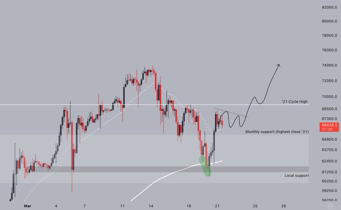 部分分析师认为,比特币可能会通过更深的下跌来重置「牛市的可持续性」。匿名加密货币交易员 Jelle 在 X 平台分析称,除非 BTC 守住 65,300 美元的水平,否则回调不会结束,价格可能会在当前范围内继续盘整一段时间,并需要收回 69,000 美元的价格水平(2021 年的市场周期峰值)才能重新点燃涨势至更高的价格。