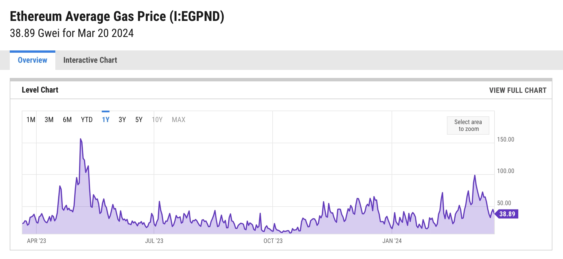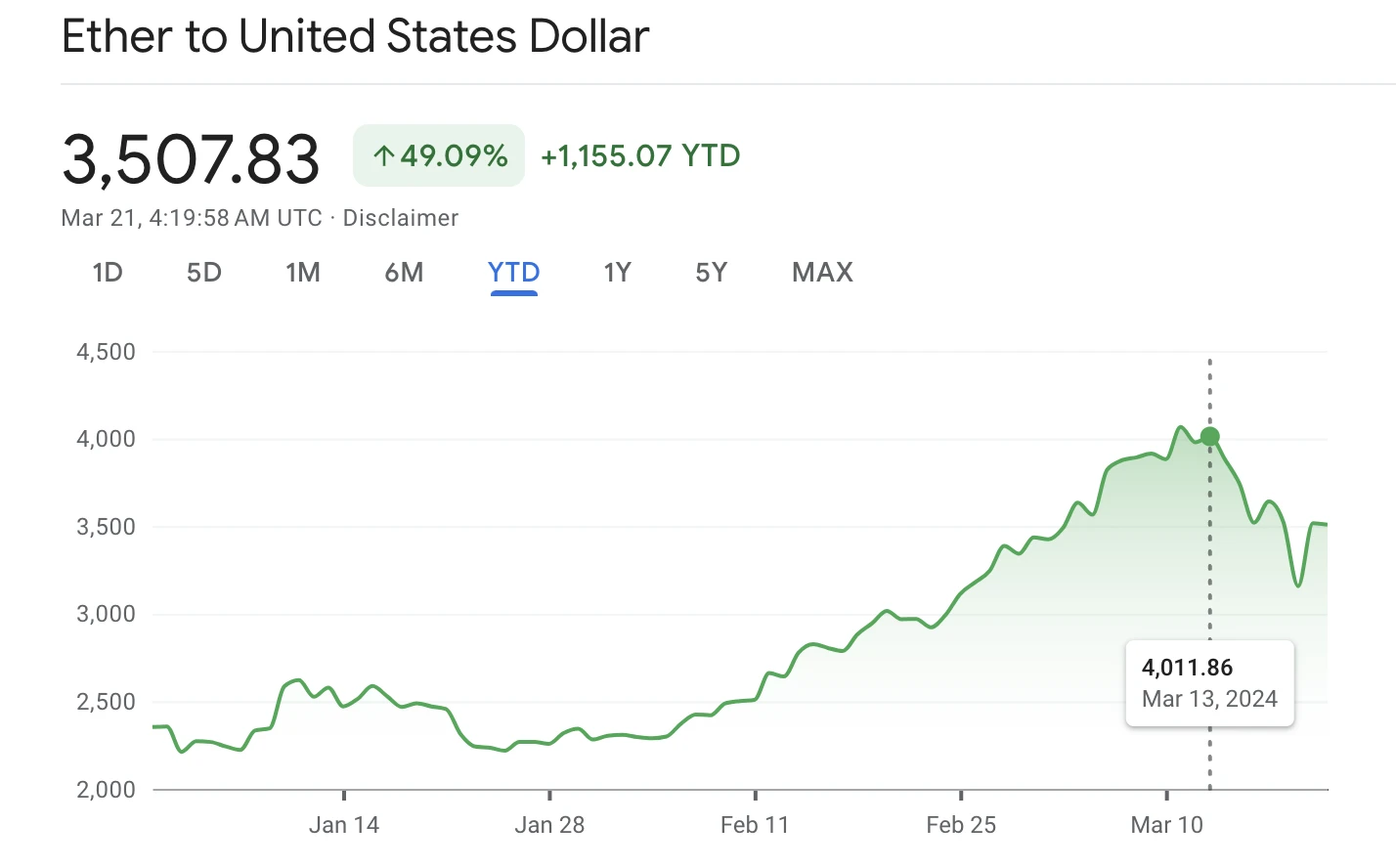 从图表中可见,直至 2024 年 3 月 13 日 Dencun 升级之日,以太坊市场持续受到热捧。来源:谷歌财经
