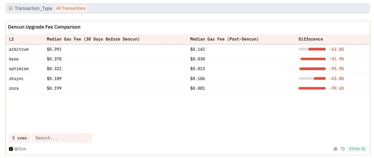 平均交易费用的变化:中位数下降 50% -99% (日期为 3 月 14 日, 来源: DuneAnalytics Dashboard)