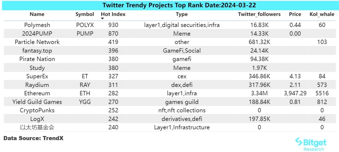 用户热搜代币&话题为:Polymesh、FLOKI、PEPE、DOGE 为代表的 Memecoin、RWA Crypto;