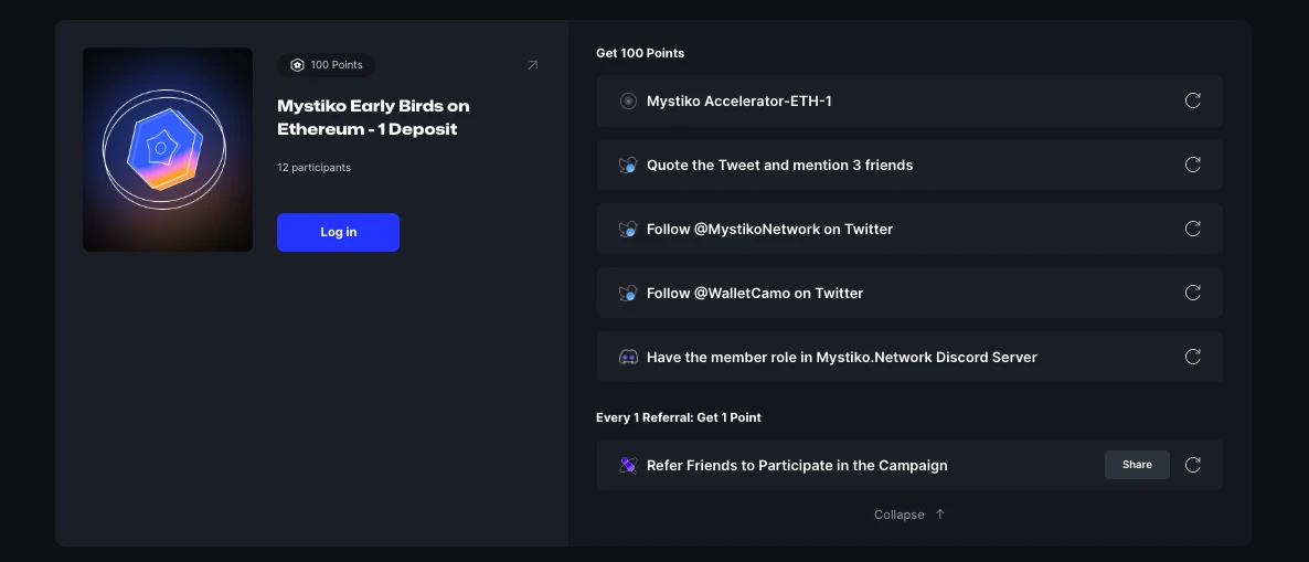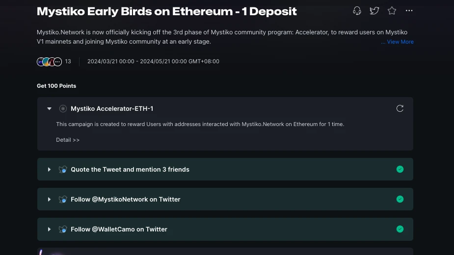 点击此任务,例如“mystiko 加速器-ETH-1 ”,用户将被引导至生态钱包 CAMO 钱包 。存款后,等待 20-30 分钟,然后可以返回 Galxe 页面进行验证。存款完成后,用户可以随时提取资金。如果存款超过 5/10/20 ,用户还将有资格参加 Galxe 中同一系列中的其他活动。 充值教程: https://docs.camowallet.app/