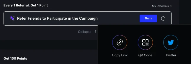 将 Galxe 链接分享给朋友,以获得任务中设置的推荐版税积分。有链接、二维码、X 三种分享方式。