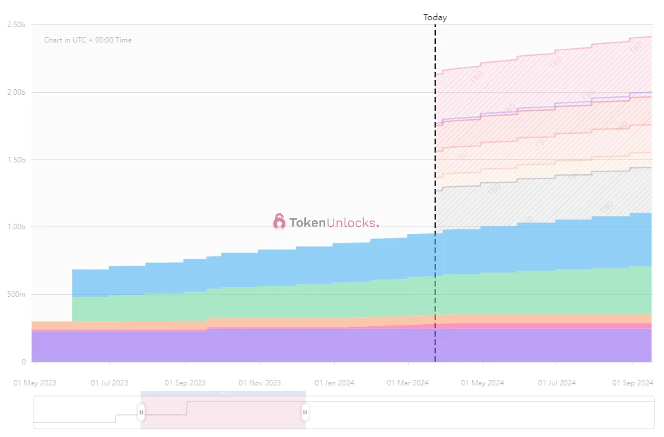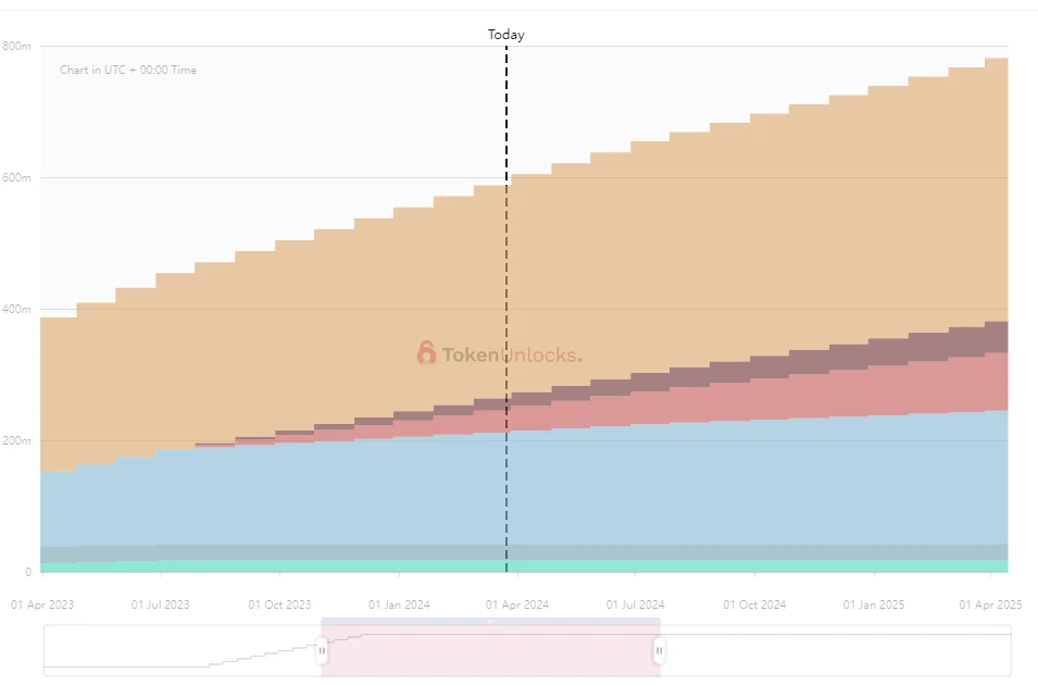 OP 目前流通量占总量的 22% ,本次面向核心贡献者和投资者解锁,前者为 1275 万枚 OP(价值 4361 万美元),后者为 1141 枚 OP(价值 3902 万美元),解锁量占流通量的 2.4% ,考虑到 OP 的高市值和高成交量,预计影响量级不高。