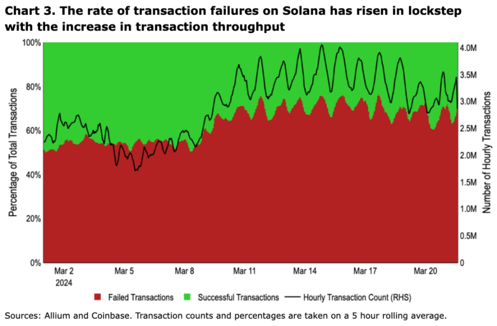 但是,高交易量会以不同的方式影响网络性能。在拥堵期间,Base 上的交易费用飙升至 Dencun 之前的水平,这使得一些定价过低的交易处于待处理状态,直到市场费用恢复到其执行的目标费率(与 Solana 不同的是它没有交易到期)。总的来说,以太坊和其许多 L2 可以通过出价超过其他交易来保证交易在区块空间内被打包,这在拥堵时期导致了更高的中位数交易成本。反观 Solana,由于它没有基于计算单位的定价(即费用与计算资源消耗没有直接关系)并且缺乏有效的优先费用机制,因此 Solana 能够始终保持较低的中位数费用。但这种方法会激励人们向网络发送垃圾交易以增加交易打包的可能性,因此正如你们最近所看到的,它导致在 Solana 上出现了大量丢弃和失败的交易。