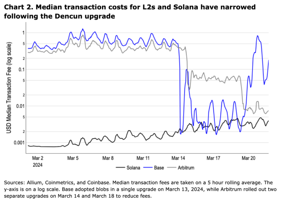 在 Meme 币狂热和以太坊的 Dencun 升级之后,很多网络的链上活动出现了激增。活跃度回升在 Solana 和某些以太坊 Layer 2 (L2)上最为明显,例如 Base,尤其是 Dencun 升级显着降低了其费用。一般而言,在低拥堵期间,这些网络的交易费中位数一直低于 0.01 美元(见图 2)。