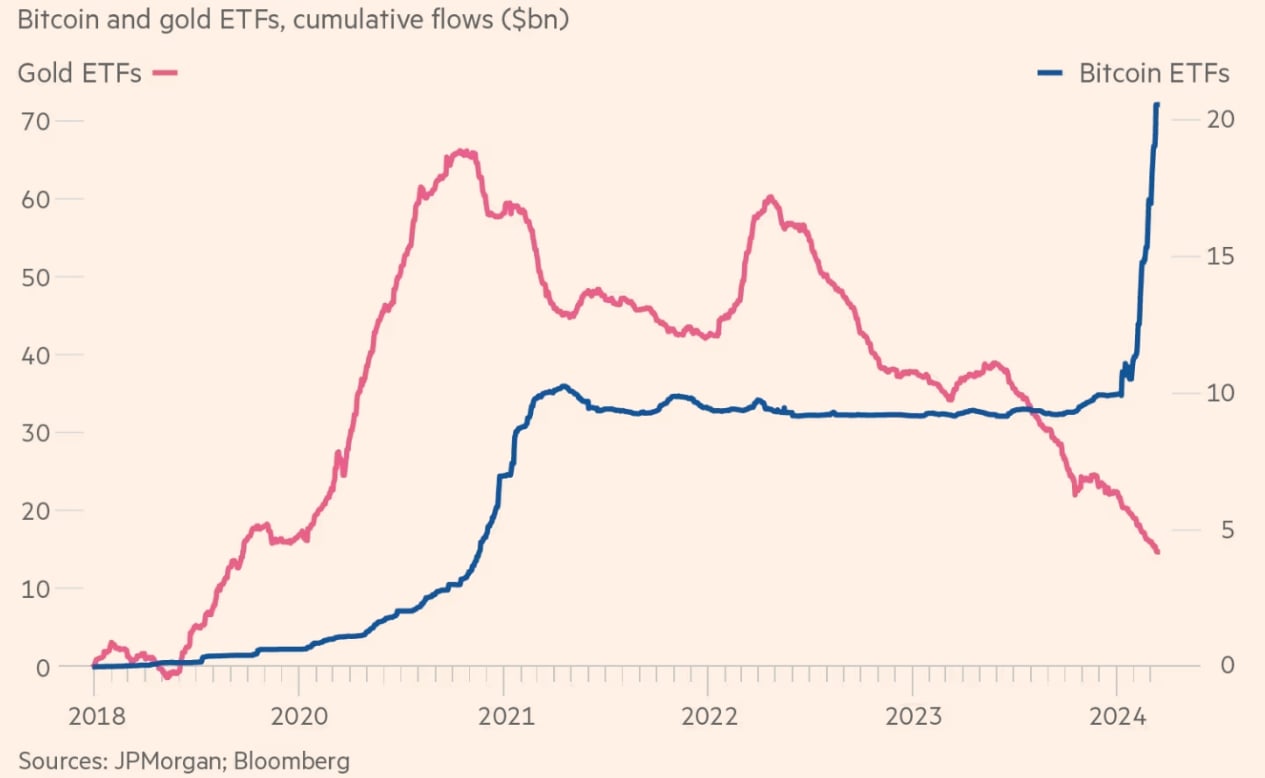 据 据金融时报 报导 ,摩根大通、彭博数据显示,截至 14 日,比特币现货 ETF 今年已吸引净流入 106 亿美元,与此同时,黄金 ETF 遭大举抛售,同期净流出 77 亿美元,这种资金流动让外界认为,投资者正抛弃黄金、转向投资「数位黄金」。