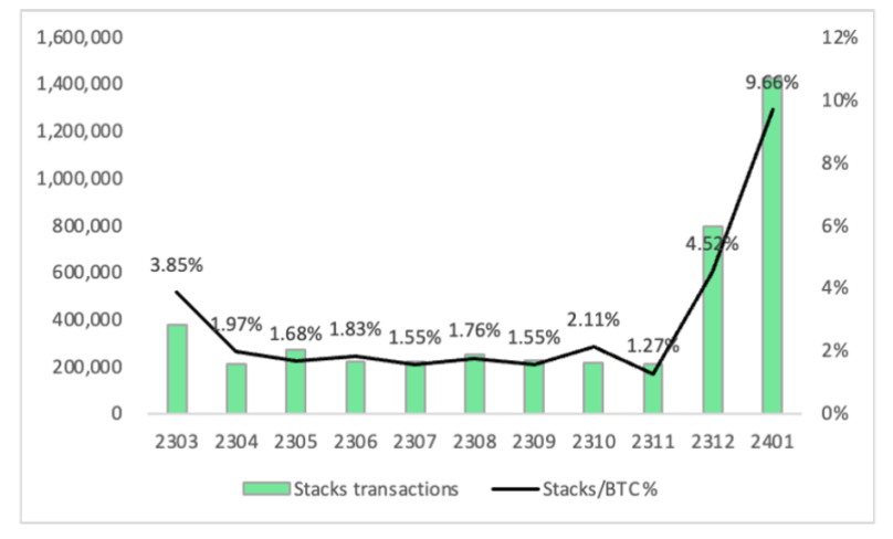 Stacks 的月交易量在数十万量级,近两月,受益于 STX 20 的蓬勃发展,交易量呈现明显上升趋势, 1 月突破 1 M 大关,接近整体比特币交易的 10% ,有力地说明了其生态采纳的良好进展。
