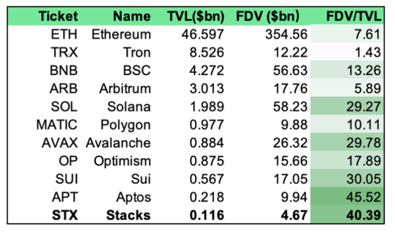 另一个维度,我们从 TVL 来看各链的估值水平: