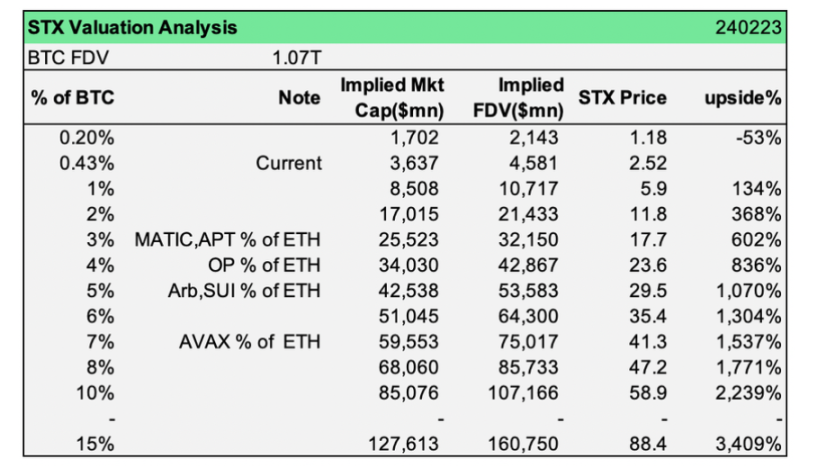 由上表可见,当前 $STX 相比 BTC FDV 仅在 0.43% ,而 ETH L2/ETH 的量级在 2% -8% 不等,即还有近 4-20 倍的空间。如果 STX 可以达到 BTC 的 1% ,则其对应价格约 5.9 ,在当前基础上 + 134% ;如果后续能接近 ARB/ETH 的水平(5% ),其价格对应~ 30 美元。