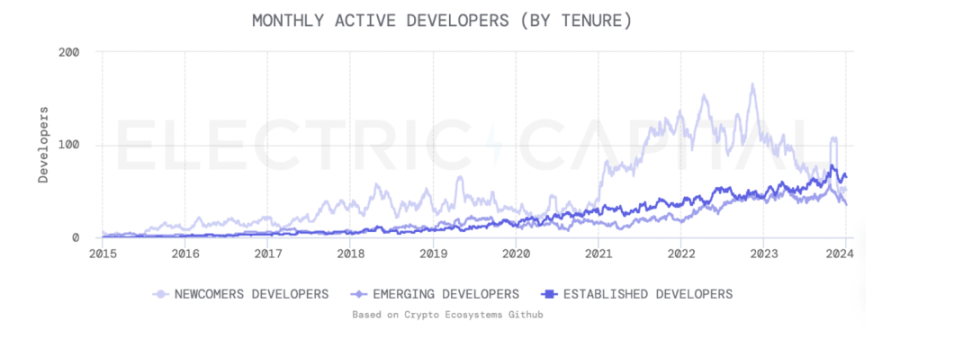 有意思的是,虽然新开发者数量震荡(更多与宏观趋势相关),成熟开发者(在 crypto 有 2 y+ 工作经验)数量却持续稳中有升,年增速 + 51% 。成熟开发者是行业的中坚力量,他们的持续稳健增长可以一定程度表明其对 Stacks 的看好,也与 Stacks 一直以来长期构建的理念相合。