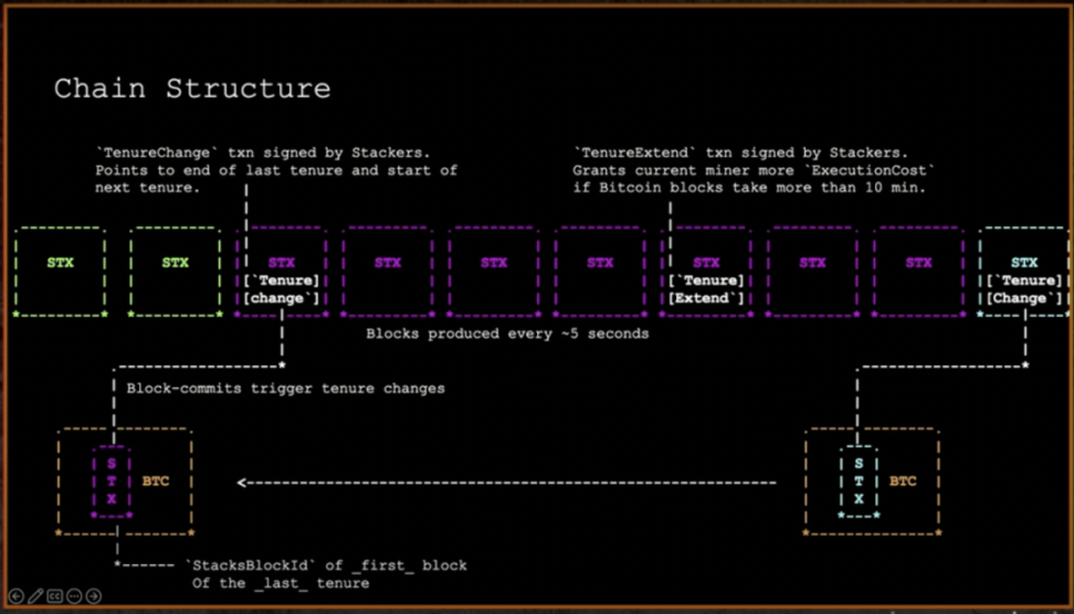 Nakomoto 升级的重头戏一在效率,生产区块的速度会提至 5 秒(当前数十分钟)。可以想见,快速区块的实现可以大幅提升 DeFi 的体验,也会使很多有意义的用例成为可能。快速区块得以实现,核心源于引入了基于 Tenure(任期)的区块生产机制——被选中的矿工负责生产任期内的所有 Stacks 区块,并以密集的节奏进行生产,约 5 秒 / 块。L2 的区块时间与比特币 L1 解耦,不再 1: 1 锚定。