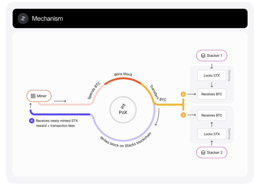 这个过程以 Proof of Transfer (POX) 共识为核心,POX 可以看做是对 POW 的再次利用,不消耗额外过度的能源。当前机制具体如下图所示: