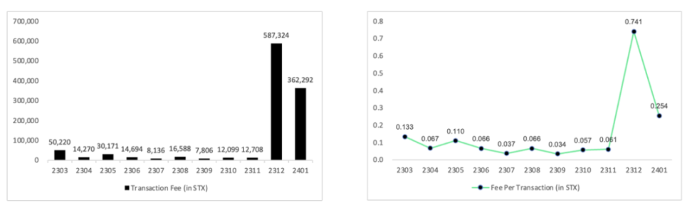 这也带动整体的月交易手续费增长至数十万 STX,平均单笔交易手续费在 0.25-0.75 STX,以 1 月 $STX 价格计(~$ 1.5),约对应 $ 0.75 。之前链上交易活动不活跃且 STX 价格更低时,单笔交易更便宜。低交易成本是生态繁荣的必要条件之一。