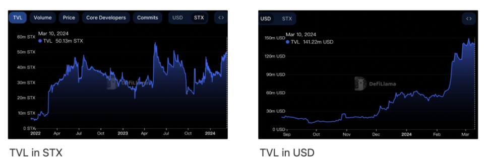 DeFi 先行是常见的路径,Stacks 生态也不例外。近期伴随着 $STX 价格的上涨,TVL 突破了 1.4 亿美金:
