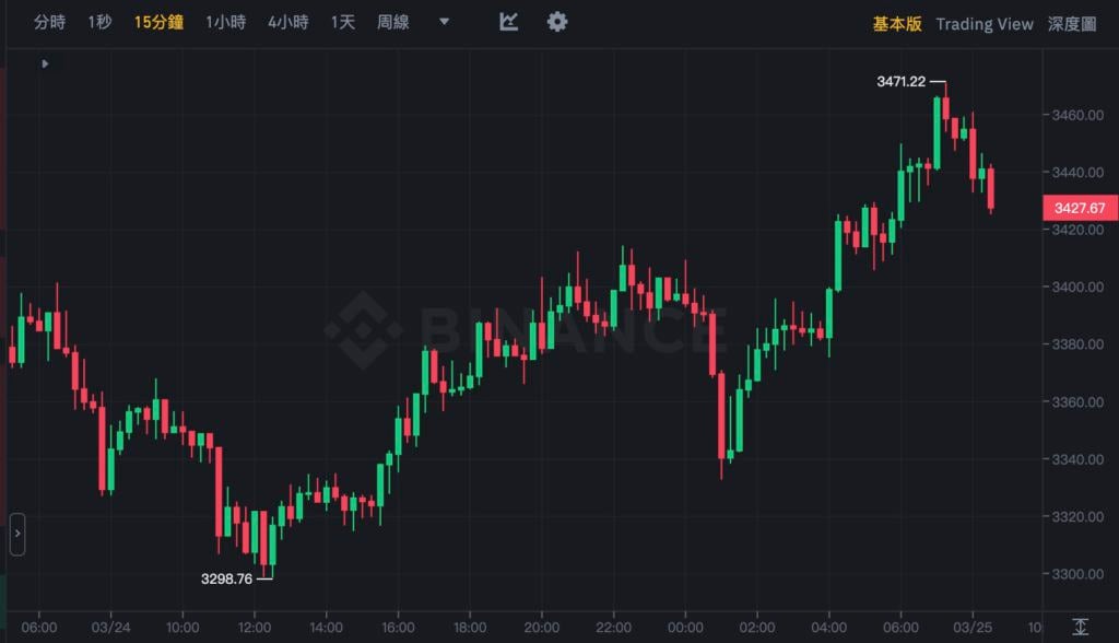 以太坊(ETH)的部分,走势与 BTC 接近,清晨最高触及 3,471 美元之后有所回调,截稿前现报 3,427 美元,近 24 小时上涨 2.12%。