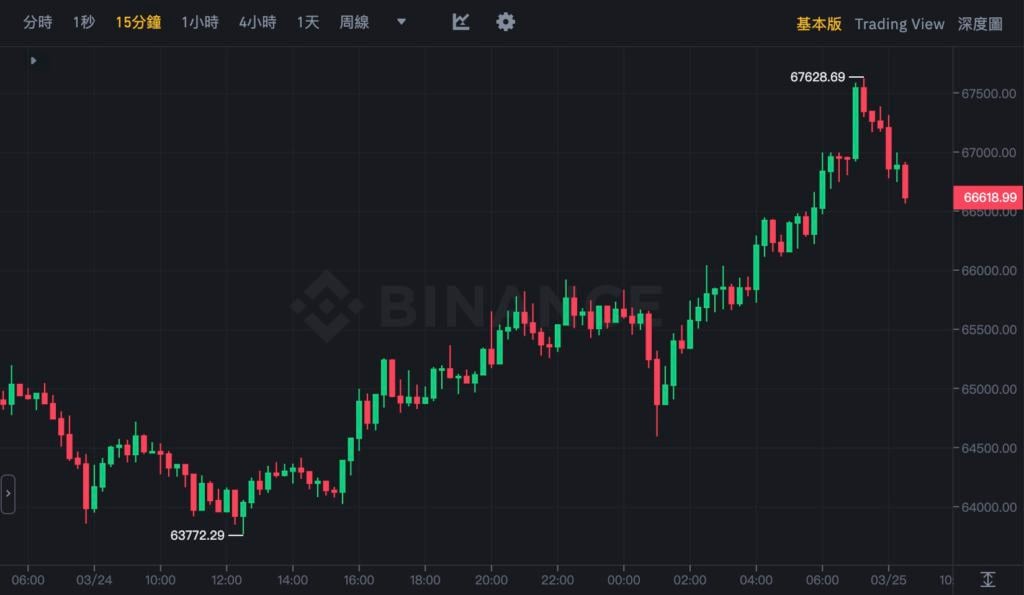 比 特币(BTC)在周(24)日最低来到 63,772 美元之后,就持续震盪上涨。今(25)晨七点左右最高更逼近 67,628 美元。