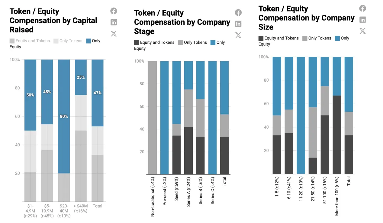 融资 500 万至 1990 万美元的公司通常仍处于种子轮阶段,员工超过 10 人。越来越多的此类公司开始提供代币薪酬,并开始更频繁地提供股权和代币的混合薪酬。其次,随着员工数量的增加,公司通常更有可能同时提供股权和代币。