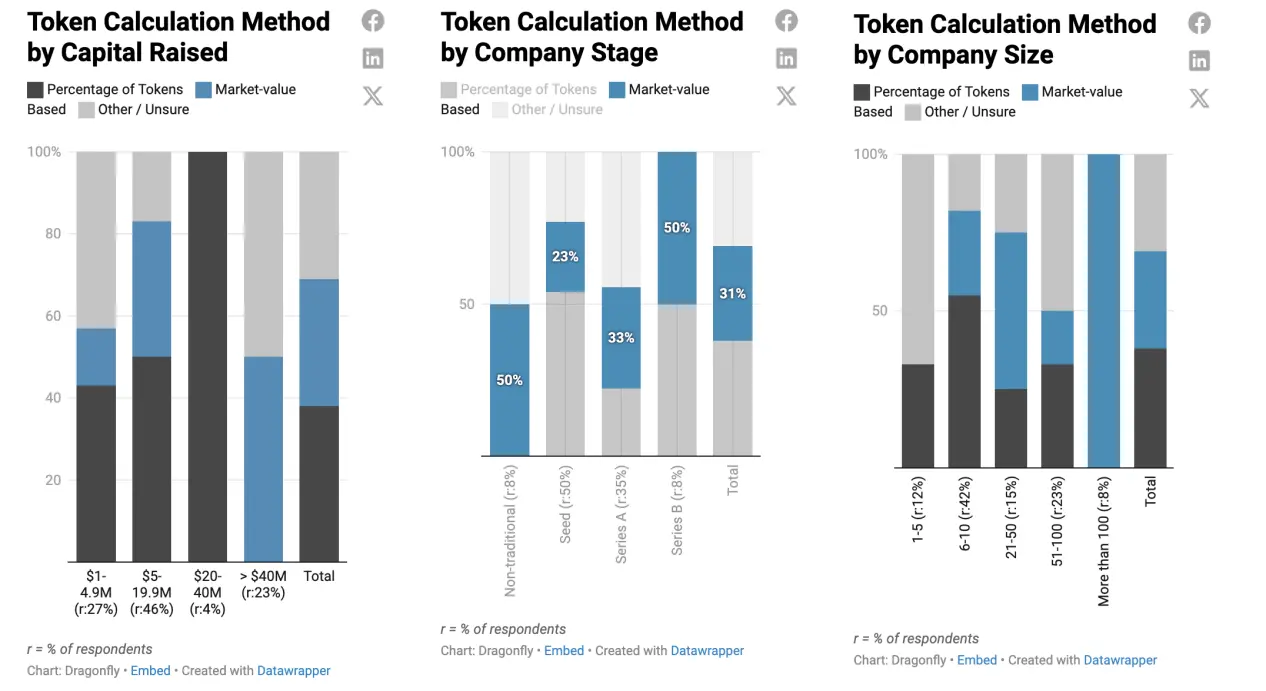 大多数公司使用“代币百分比”方法来计算代币价格,更多公司在后期融资阶段使用基于市场价值(FMV)的方法