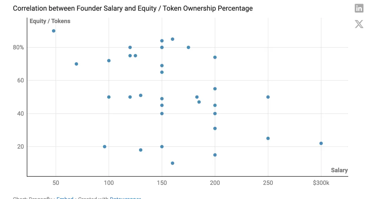 随着公司进行更多次融资,如上图所示,创始人的薪水增加,而股权/代币所有权会随之降低,原因大概是由于股权稀释。大多数创始人报告的 B 轮薪酬低于中位数。