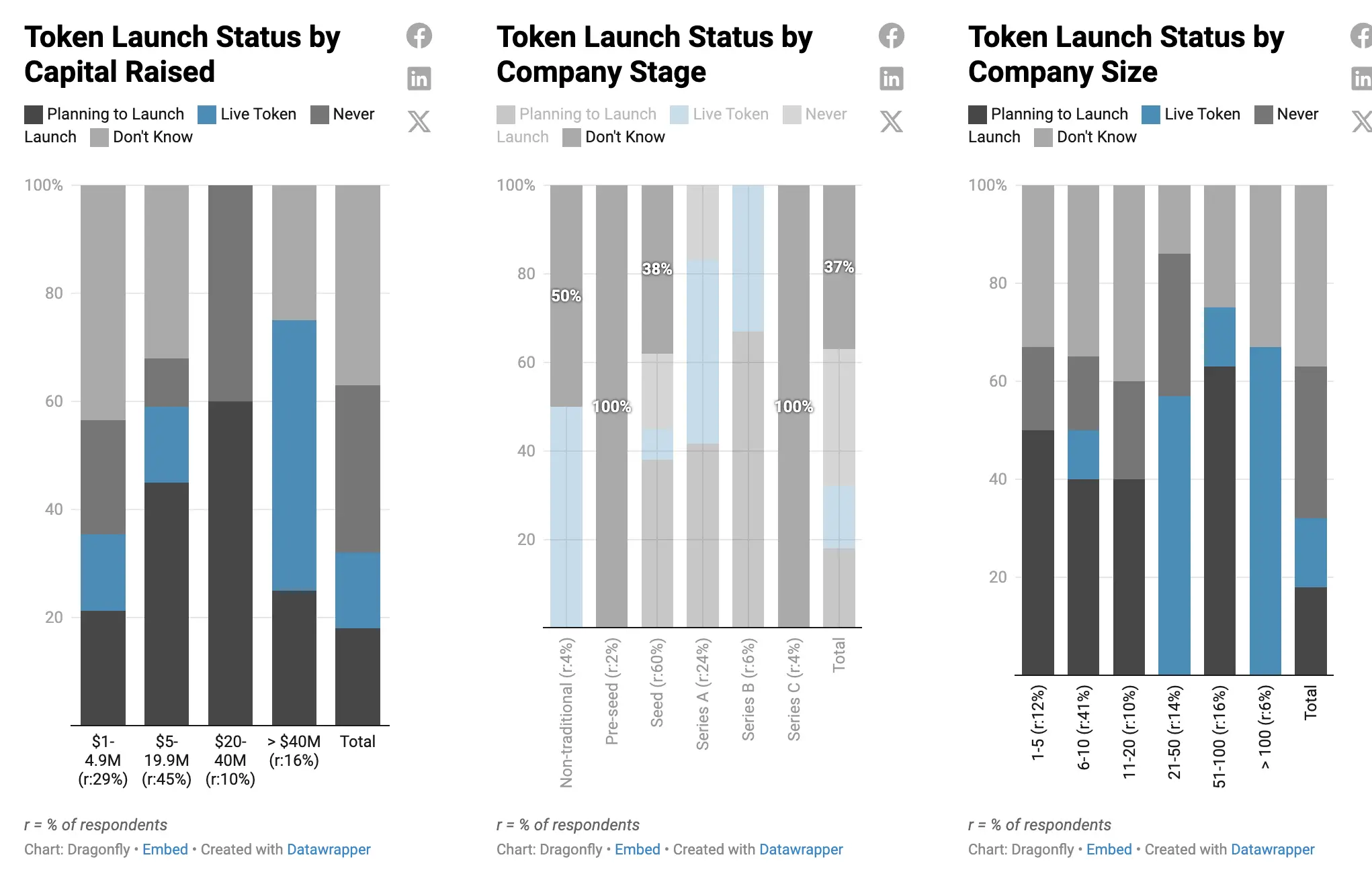 对于资金超过 4000 万美元、员工超过 100 人的大公司来说,发行代币的比例要高得多。一般到了 C 轮融资阶段就会出现明确的发币计划,并思考代币如何适用于已经成熟的产品,或者考虑在新项目/风险投资中使用代币。