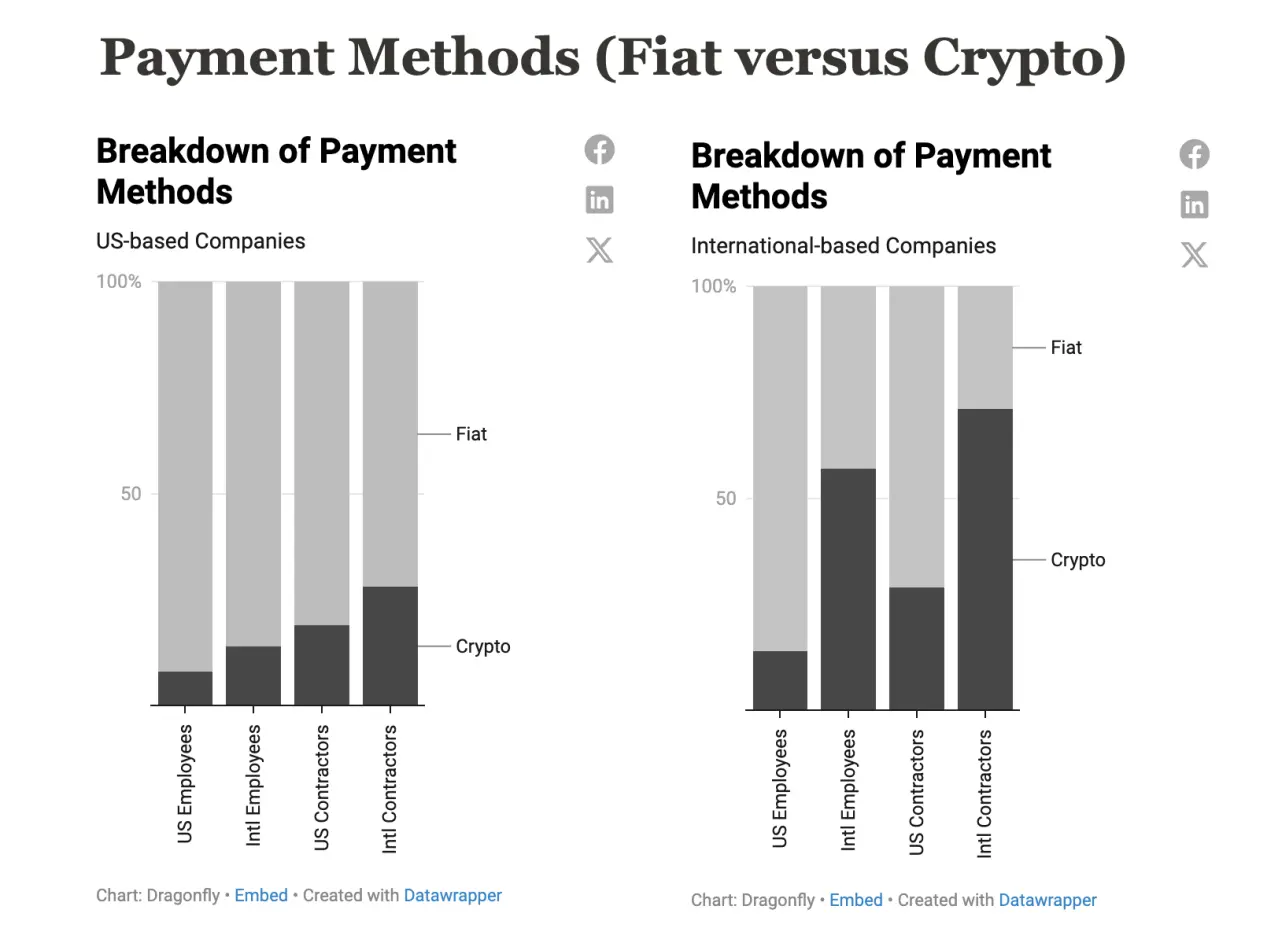 大多数情况下,公司都会采用法币支付。国际公司在加密支付方面处于领先地位(如USDC),总部位于美国的公司更有可能通过 crypto 承包商而不是直接发给员工。