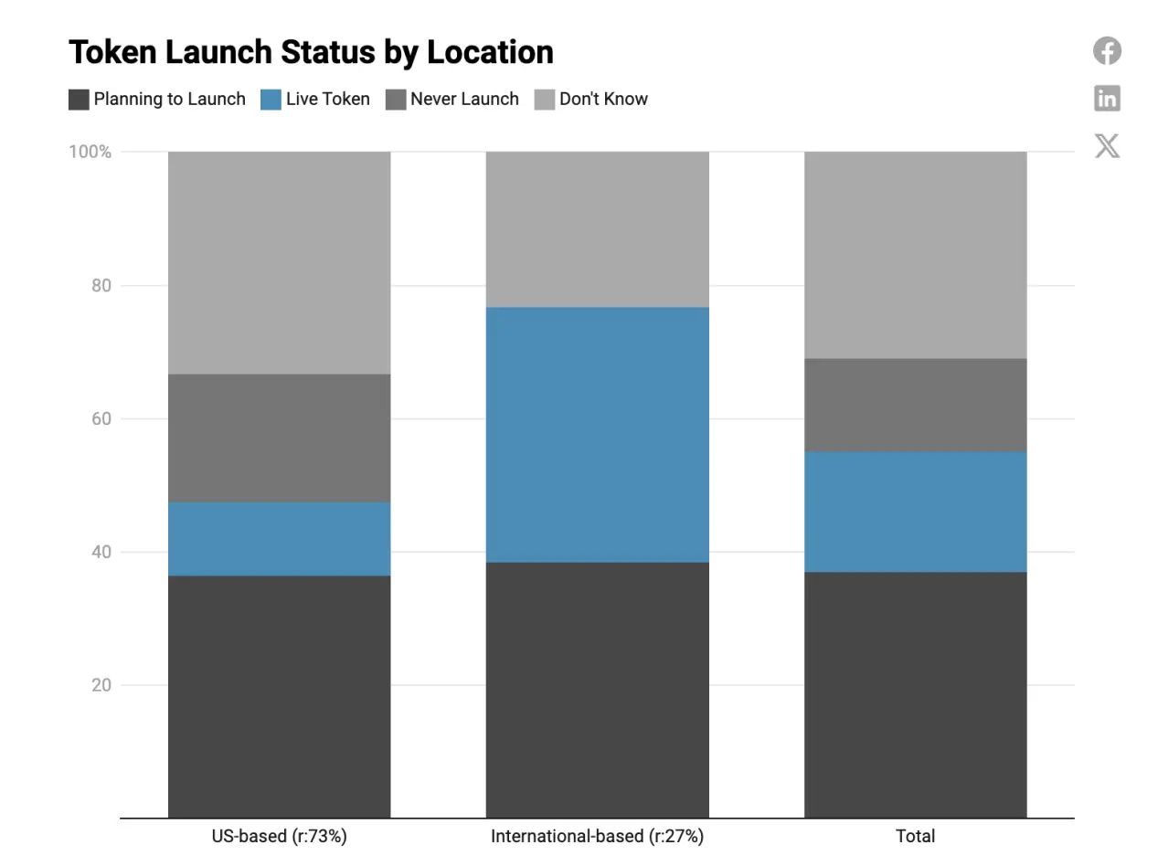 国际公司更有可能发行代币,已有代币或计划发行代币的比例更高。总部位于美国的公司(或鉴于监管环境),更多团队选择完全不发行代币。