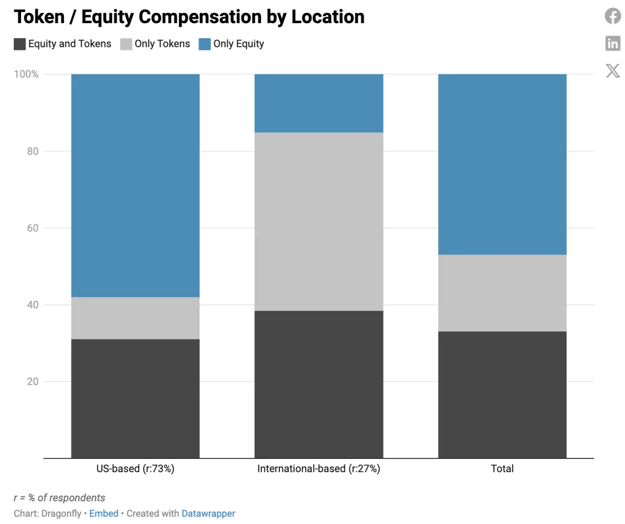 一定比例的美国和国际公司提供股权和代币的组合作为薪酬;其偏好有所不同:更多的美国公司只提供股权,更多的国际公司只提供代币(总体而言,国际公司似乎更倾向于代币)。
