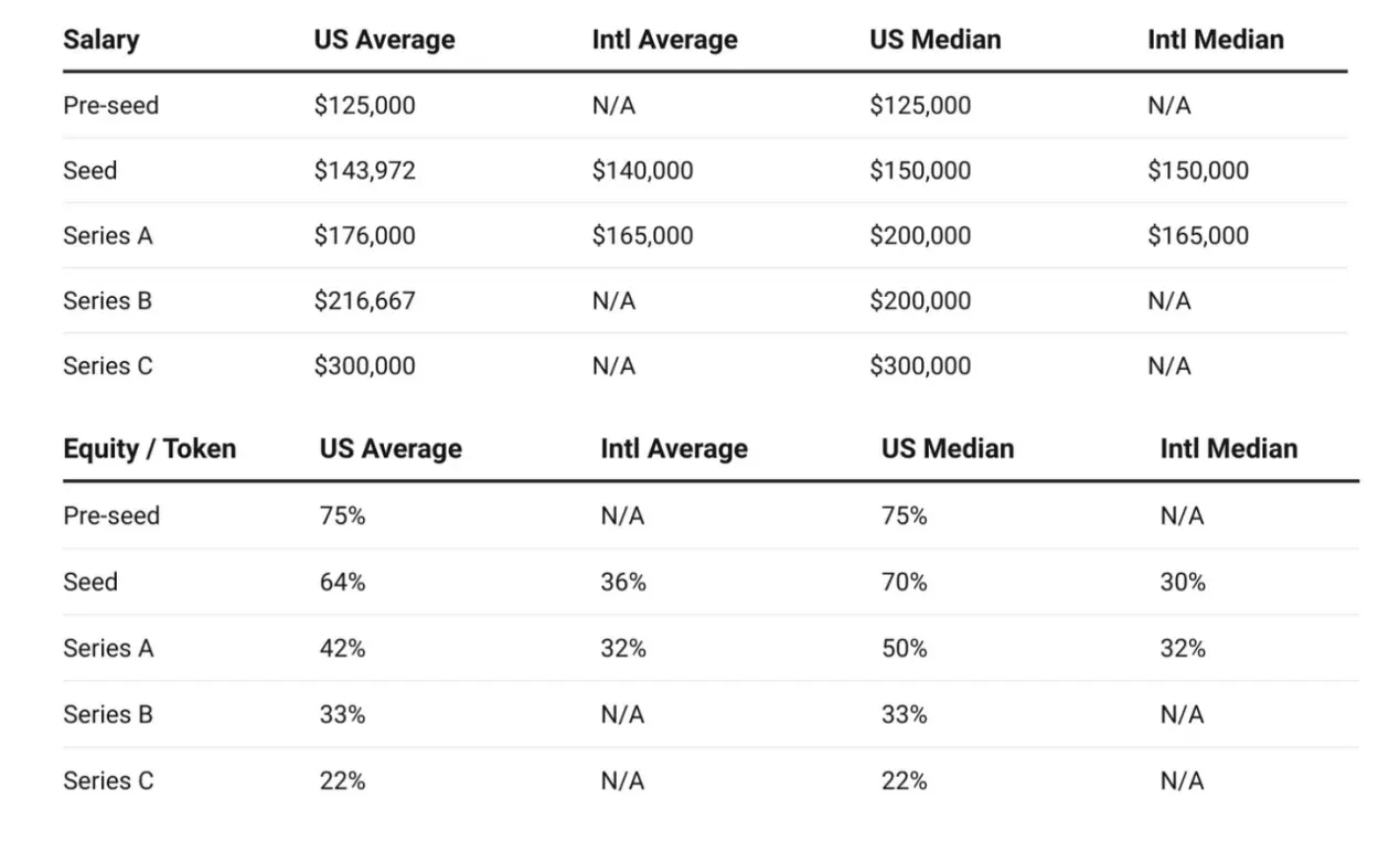 在种子轮和 A 轮融资的公司中,美国公司创始人的薪水略高,股权 / 代币所有权也多