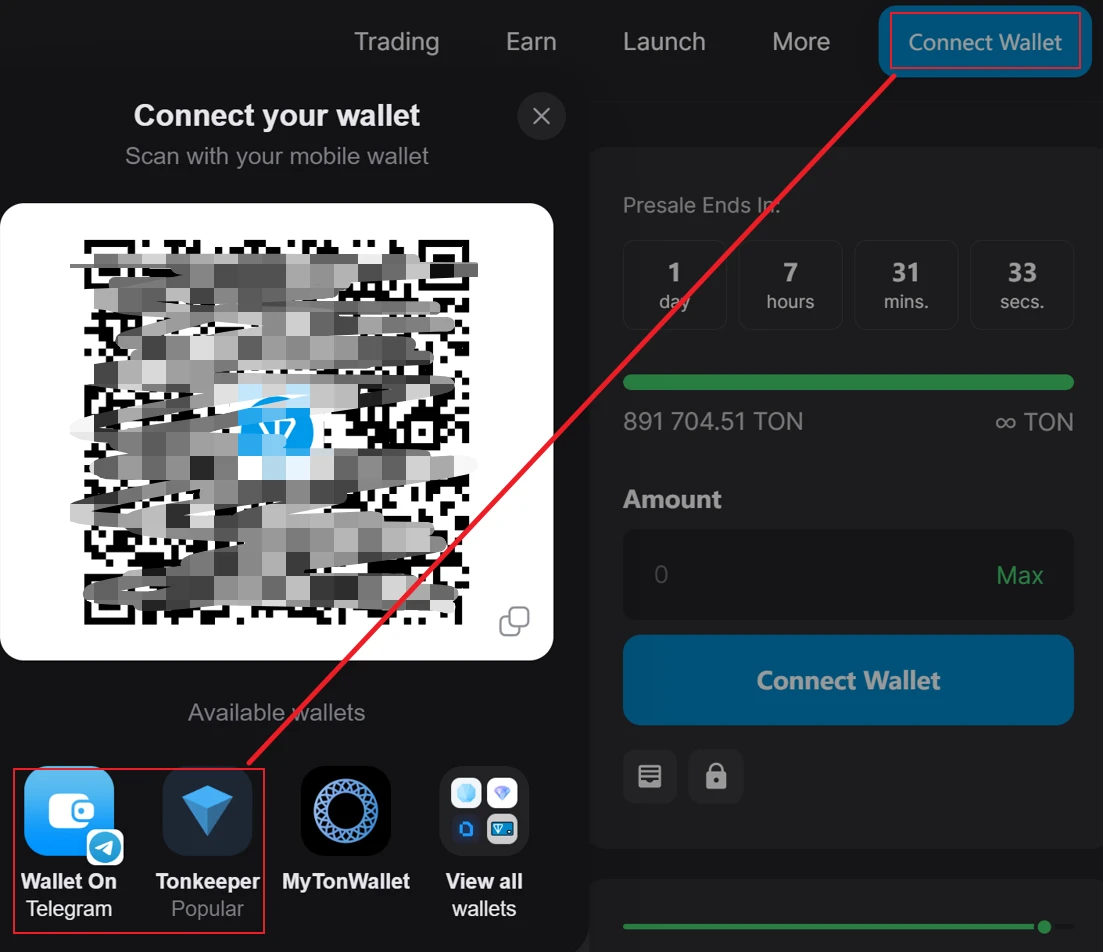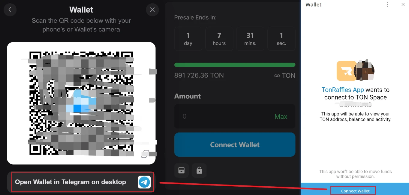 操作流程:首先进入 TonRaffles 网站 ,然后根据下图流程链接钱包。首先点击右上角的 Connect Wallet,此时将弹出钱包选项,选择用户实际安装的钱包(不限于前一节所提的钱包),以 Telegram 内置钱包为例,将弹窗并跳转至 Telegram,选择确认链接即可,而后根据计划金额打款。