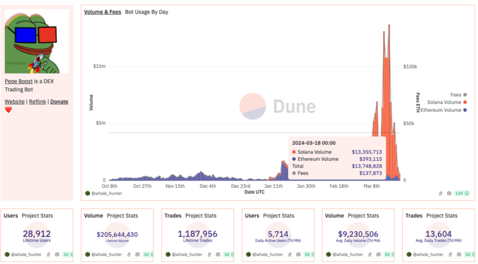 Pepe Boost 则是在中文圈最多人使用的交易机器人,原生支持中文的界面更受到华语 KOL 们的喜爱,而 Pepe Boost 在 ETH 上经营了也接近半年,良好的社区声誉加上有问必答的客服也让其踏足 Solana 后同样风生水起。