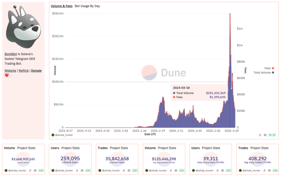 BonkBot 是由 Bonk 社区所制作的 TG 交易机器人,也是目前 Solana TG Trading Bot 之中交易量第一的机器人,BonkBot 以其简洁的使用界面为特色,也具备抗 Mev 交易、调整 Gas Fee 等等的功能,最高峰 3/18 单日交易量突破 250 M 单日手续费收入达到惊人的 1.4 M 美元,而目前数据回落平均每日交易量约为 50 M。