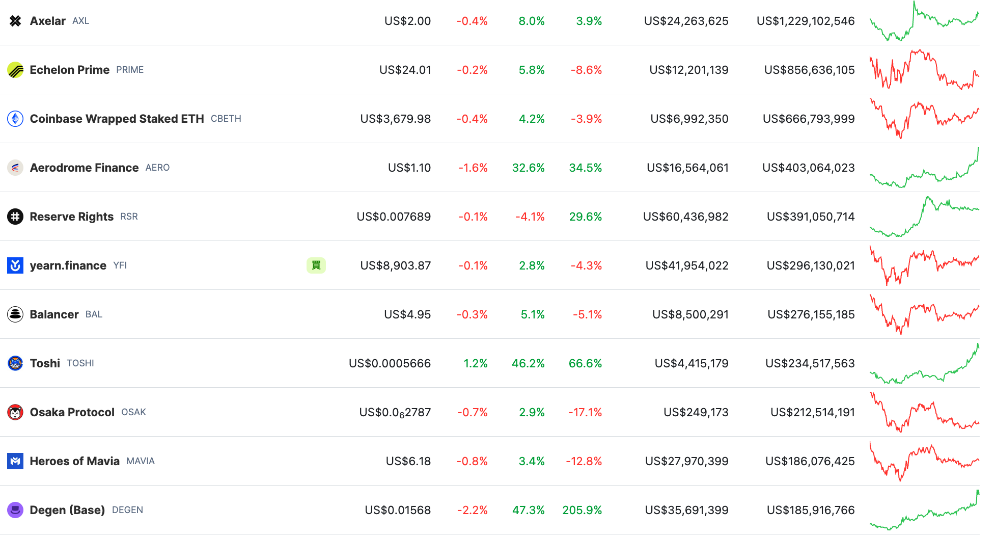 - Aerodrome ($AERO):上涨 32.6%,暂报 1.1 美元,是 BASE 生态 TVL 第一的 DEX。
