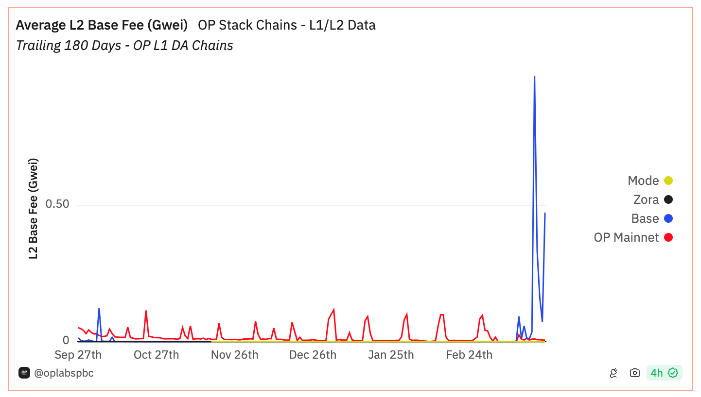 Past midnight UTC, and we can look back on the first major OP Chain fee spike Post-4844:
