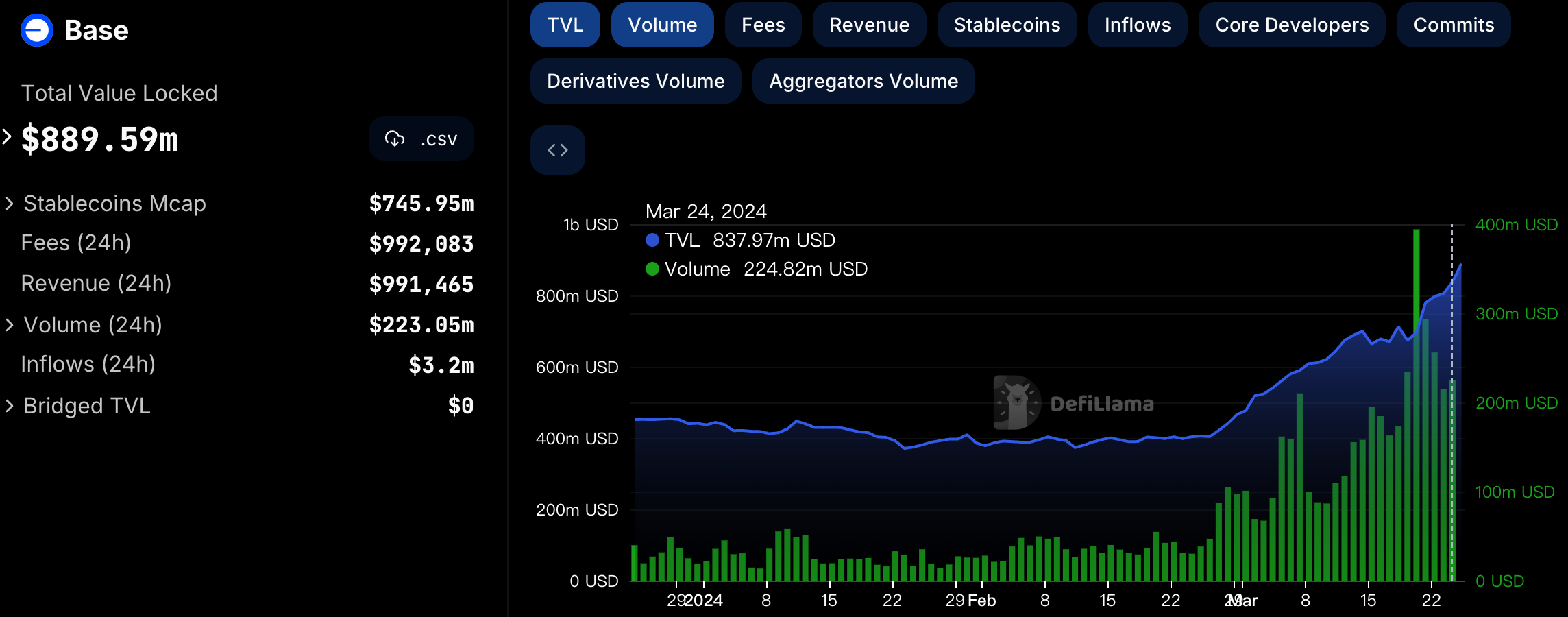 随著 Base 生态的热络发展,其 TVL 和交易量也迎来显著成长。