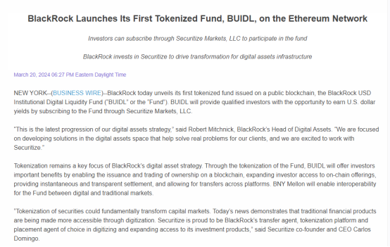 3月20日,贝莱德宣布推出了其首个在公共区块链上发行的代币化基金,即贝莱德美元机构数字流动性基金(BUIDL)。据悉,BUIDL将通过聚焦于RWA的数字资产证券公司Securitize进行认购,为合格投资者进行服务,资金将由官方托管机构纽约梅隆银行持有。该基金将总资产100%投资于现金、美国国债和回购协议,让投资者在持有区块链上的代币的同时赚取收益。