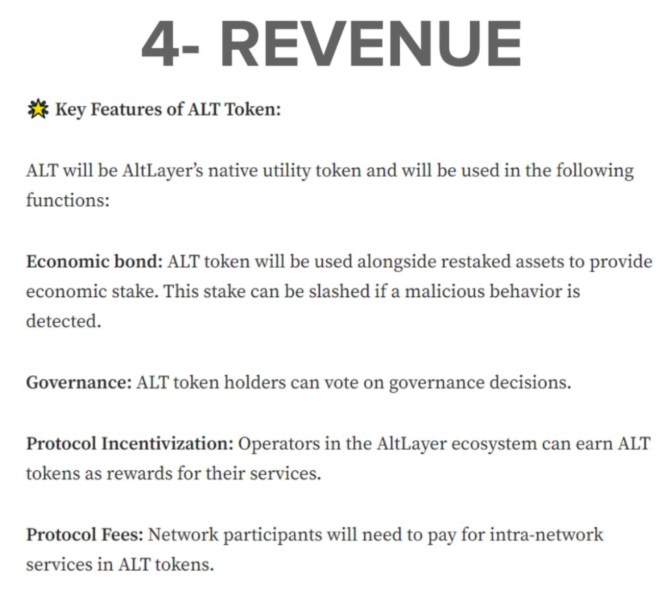 激励:AltLayer 生态系统中的运营商可以获得 ALT 代币作为其服务的奖励;