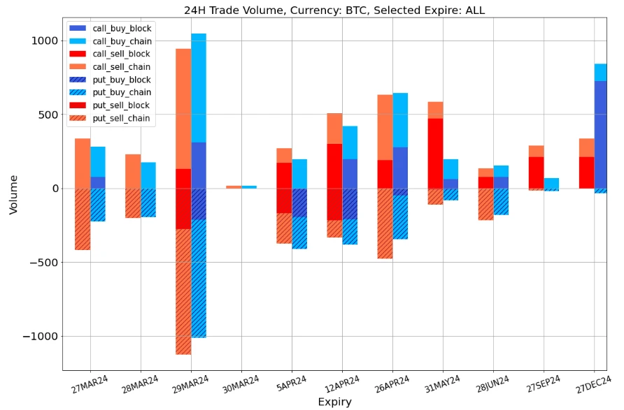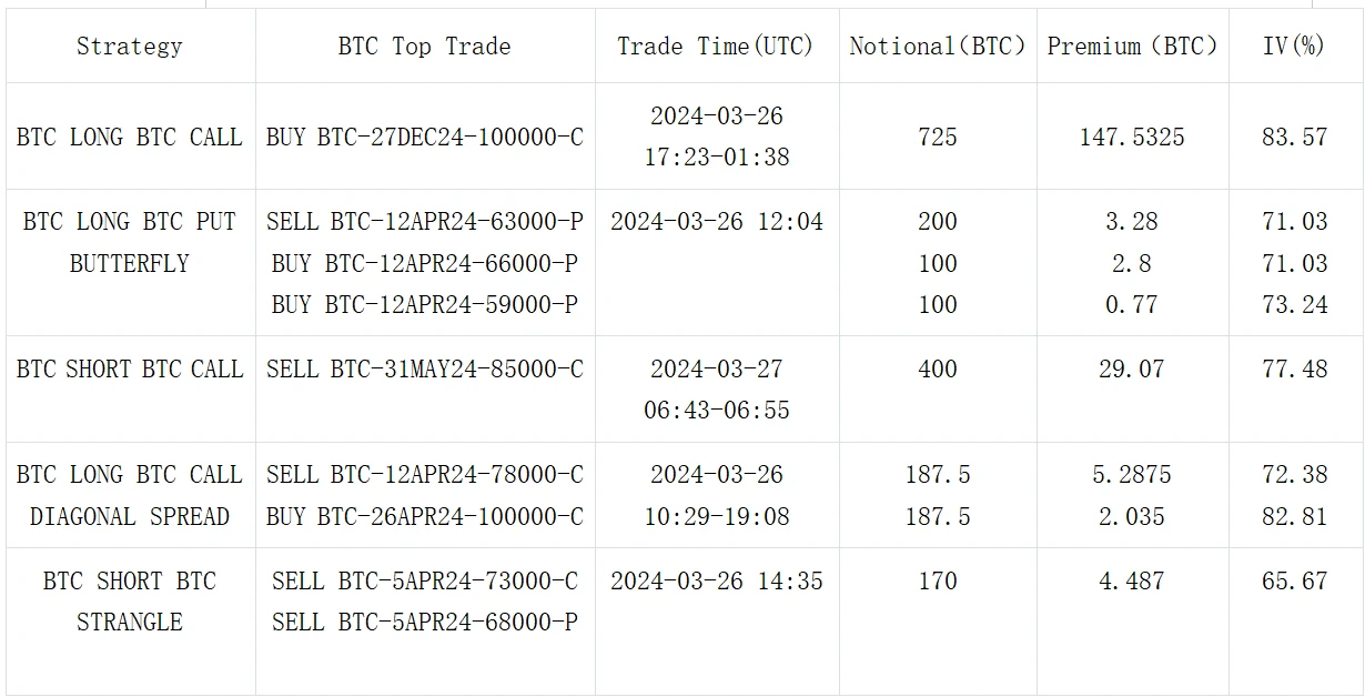 数字货币暂缓连日以来的上行趋势,在币价从近期高点轻微回落之后,BTC 和 ETH 在在过去 24 小时的大部分时间里里分别围绕着 70000 美元和 3600 美元小幅震荡,上行空间变得不那么明朗,致使期权市场下调了中前端的隐含波动率和 Vol Skew,从交易上也能看到一如 BTC Short 31 MAY 24-85000-C ,BTC Short 5 APR-68000/73000-Strangle,ETH Short 26 APR 24-42000-Straddle 为代表的看跌波动率和看弱上行动能的策略,除此之外,两币种中短期成交大多仍以防守性质的看跌价差策略作为主要基调,BTC 部分成交向中远端发生转移,其中 27 DEC 24 100000-C 获得累积 725 BTC 的大宗买入,为昨日最大开仓头寸。