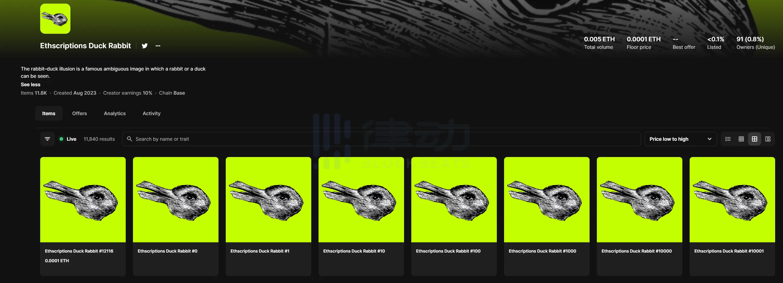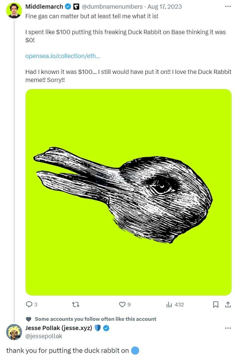这条推文中提到的「Duck Rabbit」是 @dumbnamenumbers 所喜爱的 meme,他在去年 8 月份曾把这张图放到了 Base 网络上。