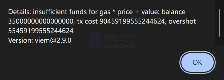 因此,大量玩家开始跟着打 Blobscriptions 版本的「Duck Rabbit」。小编撰写此文的时候,Gas 已经狂飙。根据下图的余额不足提示,此时打一张 Blobscriptions 版本的「Duck Rabbit」成本大约需要 0.1 ETH...