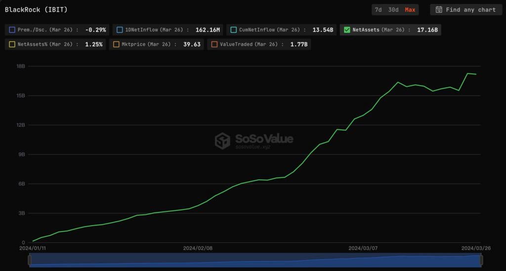 SoSoValue 数据 显示 ,贝莱德的 IBIT 管理资产规模已达到 171 亿美元,且占所有比特币现货 ETF 日均交易量的 40% 以上, 随著灰度的 GBTC 资产管理规模已迅速下滑至 230 亿美元,IBIT 似乎即将取代 GBTC、成为规模最大的比特币现货 ETF 。这也让 Larry Fink 表示: