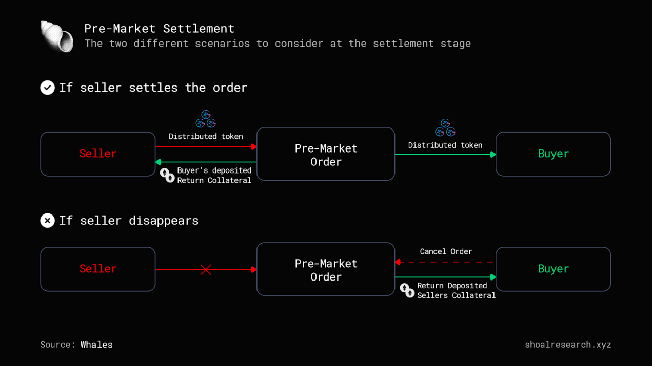 卖家和买家都需要等待 TGE 才能结算或取消订单。当 TGE 发生并由基金会释放代币时,买卖双方之间的结算将会倒计时 24 小时。如果卖家未能及时结算,将失去抵押资金。如果买家决定取消订单,这些资金将转移给买家。