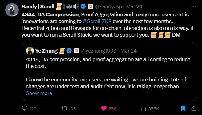 Scroll 团队成员积极与他们的社区互动,甚至委婉地说未来将有“链上互动的奖励”。