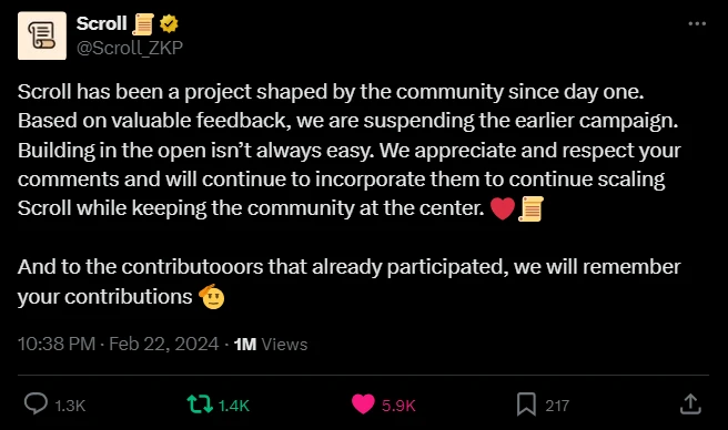 Scroll 进行了一次全面的 Galxe 活动,他们在其社区表达不满的同一天就撤下了活动。