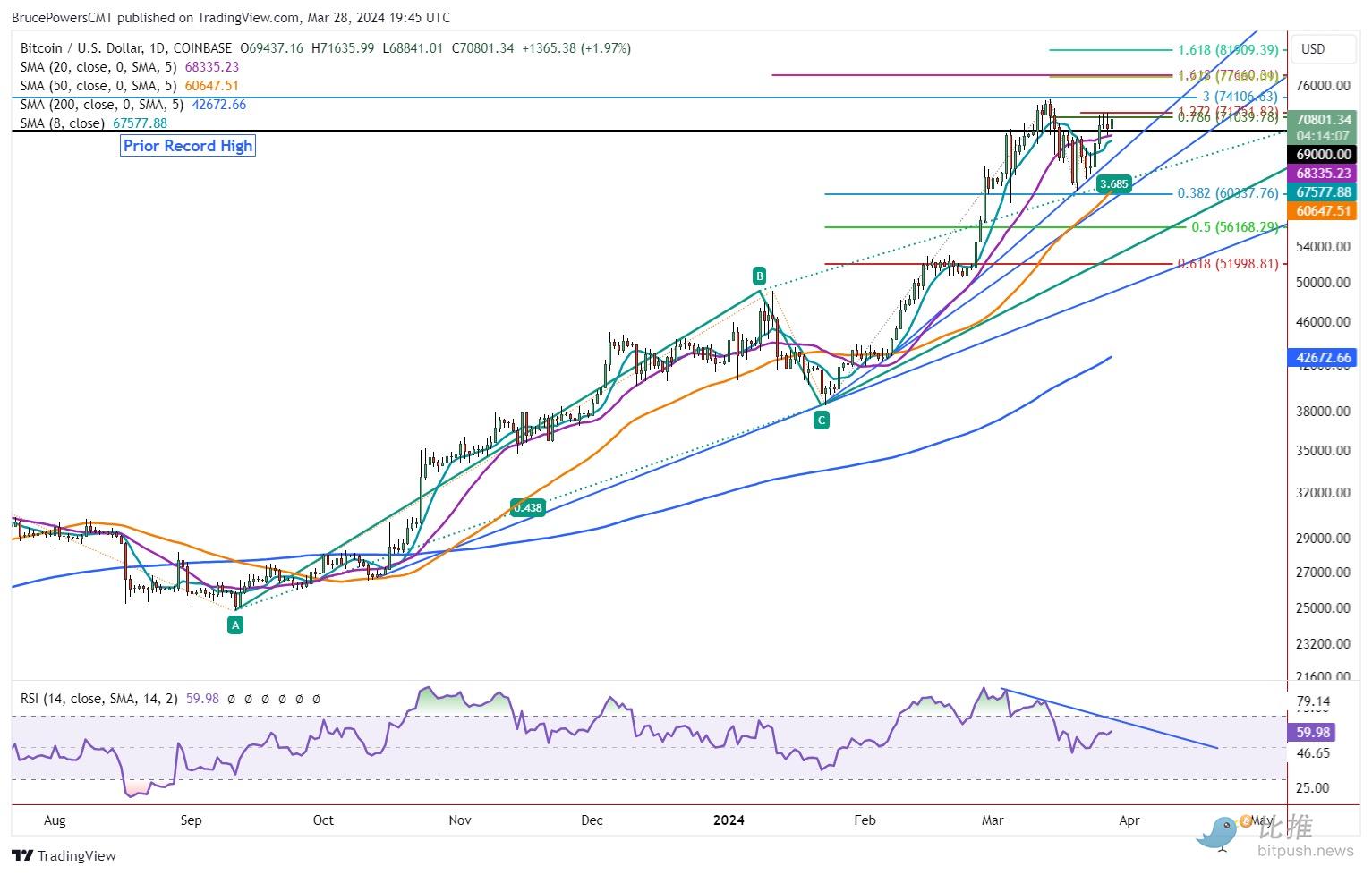 加密分析师 Bruce Powers 认为,过去四天,比特币一直在 78.6% 斐波那契回撤位的阻力位附近受到冲击,面临 71,790 点阻力,过去几天交易一直保持在 20 日均线上方。上升趋势保持不变,但 RSI 的看跌背离表明回调可能还会进一步进行。突破本周高点 71,290 点的决定性反弹将引发上涨趋势的看涨延续,初步新高目标位于 77,660 点左右,该目标位由两个斐波那契水平确定。